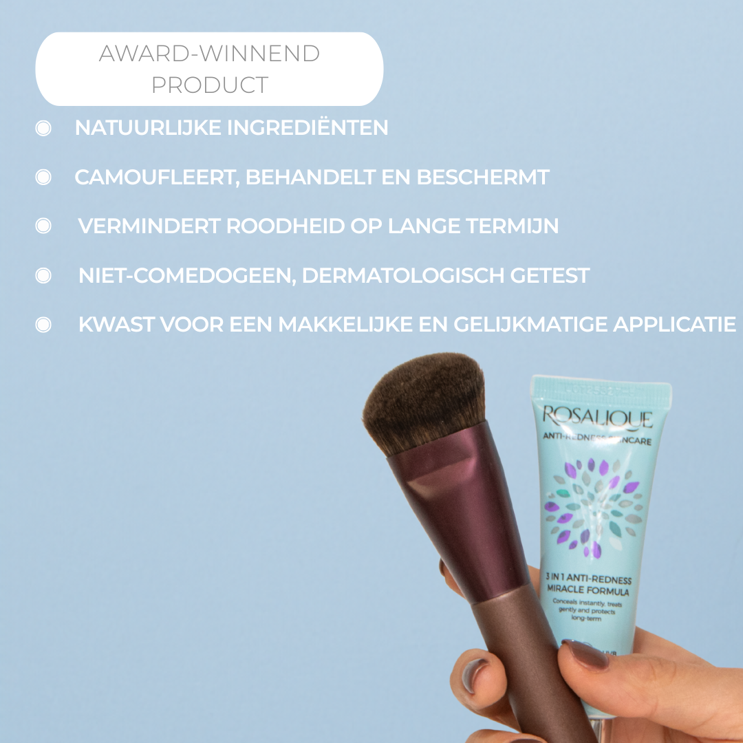 Speciaal ontwikkeld voor de overgevoelige en rode huid. Onze 3 in 1 formule camoufleert onmiddellijk dankzij de unieke met pigment gevulde microcapsules, bevat 5 klinisch bewezen ingrediënten die roodheid verminderen en de huid kalmeren, en biedt langdurige bescherming tegen UVA/UVB straling met een SPF50.