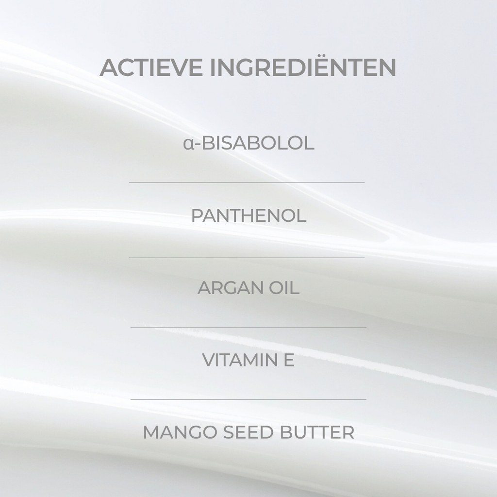 Met α-Bisabolol • Panthenol (Provitamin B5) • Mango Seed Butter • Ascorbic Acid (Vitamin C) • Shea Butter •  Zinc • Urea